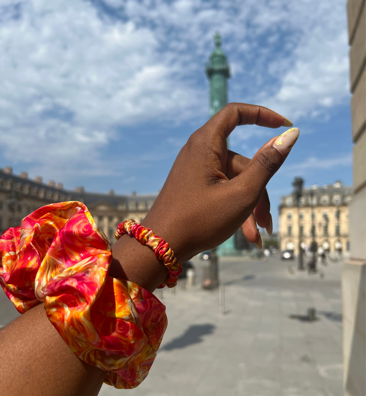 This is the most perfect scrunchie ever. It's larger than a normal scrunchie but not too obnoxious. The color and feel of the silk is unbeatable and a great staple to spice up an outfit or to simply protect your hair when going to sleep.